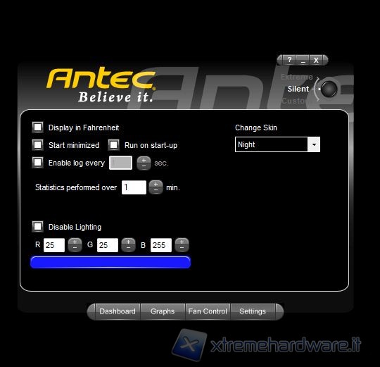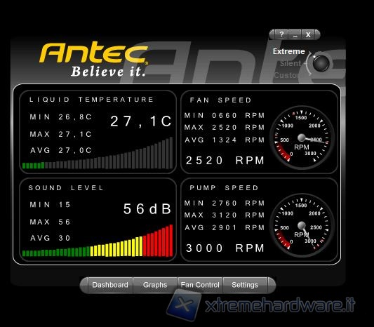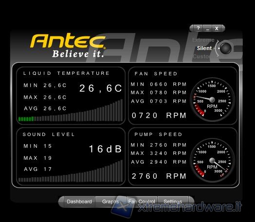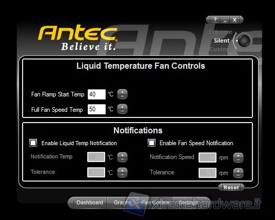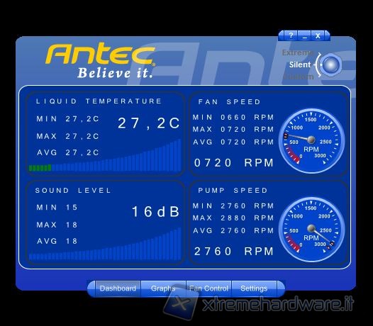 Il software è molto pratico ed è possibile selezionare diversi profili, quelli personalizzati, silent ed infine extreme, dove le ventole saranno settate al massimo dei giri. In quest’ultimo caso il rumore generato sarà davvero insopportabile, ma il fine ultimo di questa impostazione non è altro che avere un’idea delle massime performance possibili, e quindi effettuare test di overclock senza timore di avere temperature troppo alte.